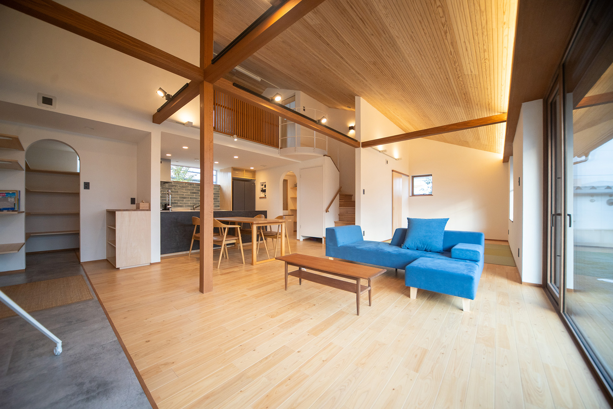 19帖の広々とした開放的なLDK。玄関と畳コーナーを含めるとなんと28帖。